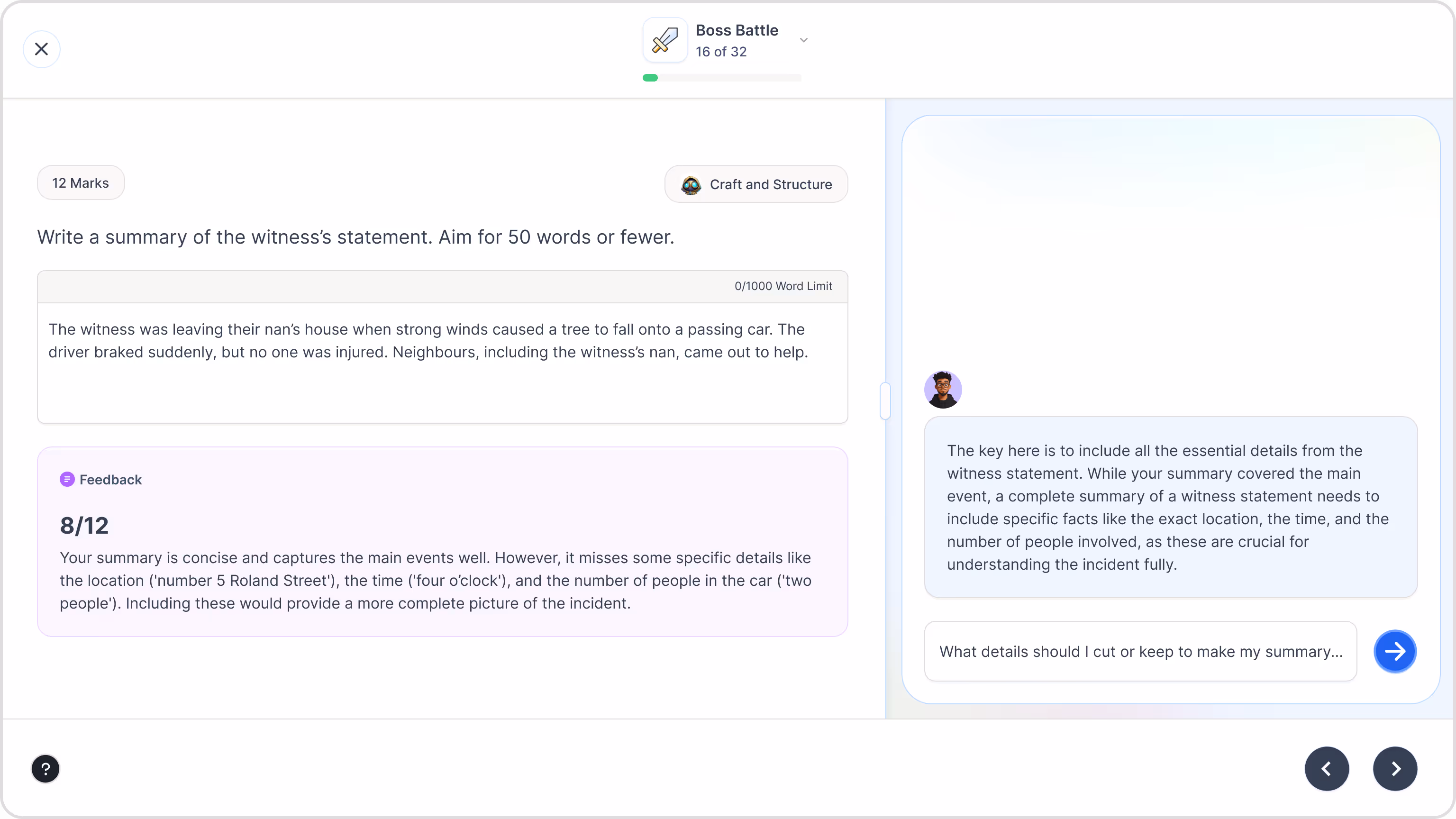 Marking that goes beyond right or wrong with detailed feedback aligned to exam board standards.